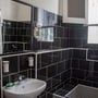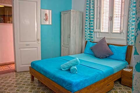 Habitación "Mar",con decoración azul turquesa, es la habitación más tranquila al final del pasillo,bien ventilado con 2 ventanas, aire acondicionado con baño proprio más pequeño y bien equipado.