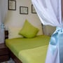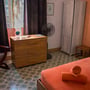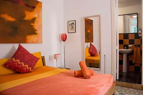 Habitación "Mango", con decoración naranja, espaciosa con aire acondicionado, ventana al jardín y baño privado.