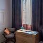 Habitación "Manzana", con decoración verde, relativamente grande con cama dosel y aire acondicionado, una ventana al patio y un baño espacioso.